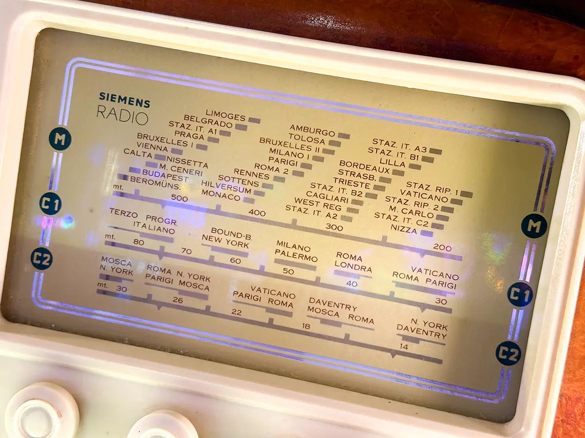 VINTAGE RADIO CONVERTED INTO BLUETOOTH SPEAKER. Model Siemens SM6033 from 1952. Made in Milan. Warm sound. Very beautiful wooden structure. Dimensions: 60 cm x 30 cm, depth 21 cm.