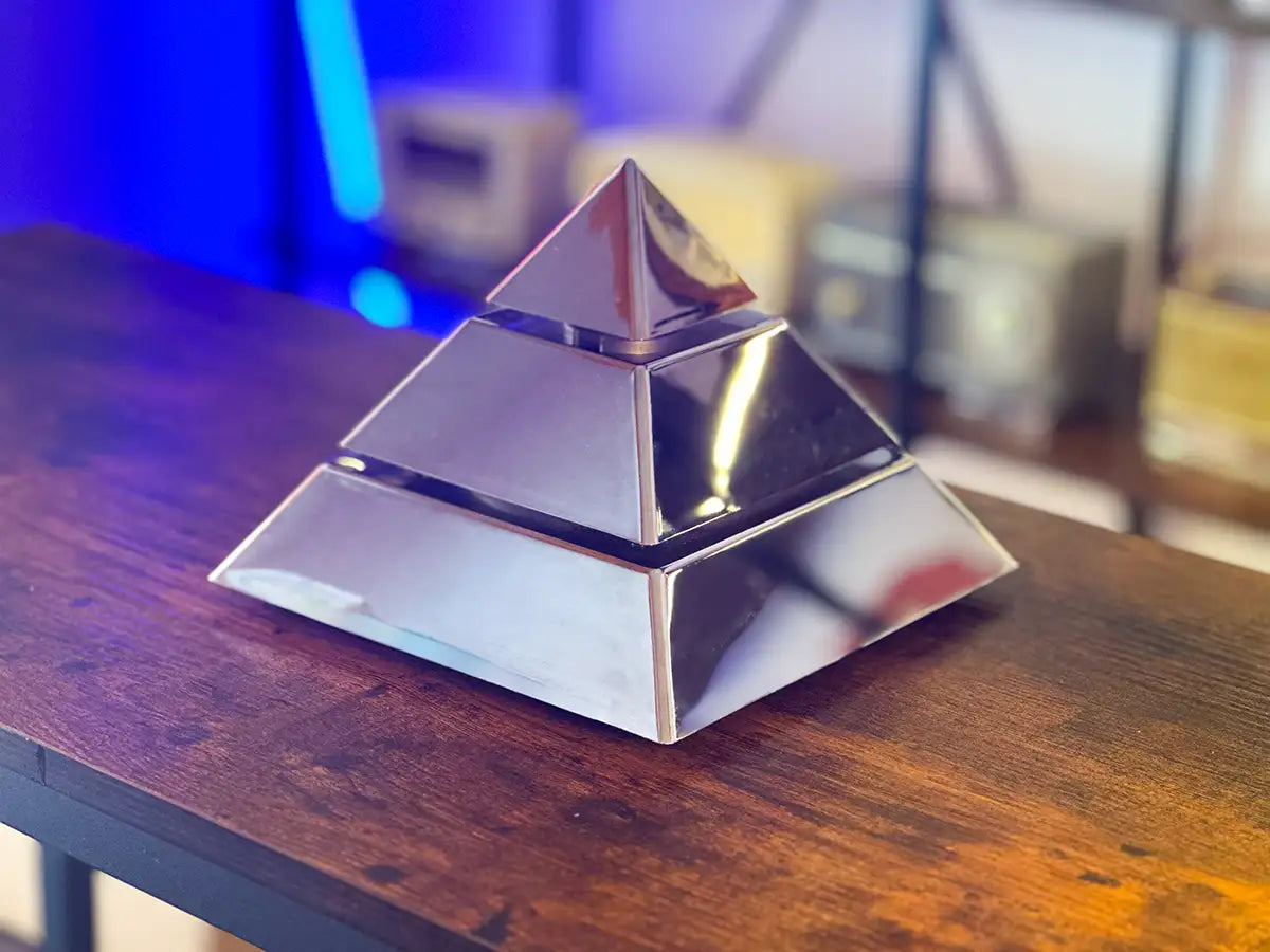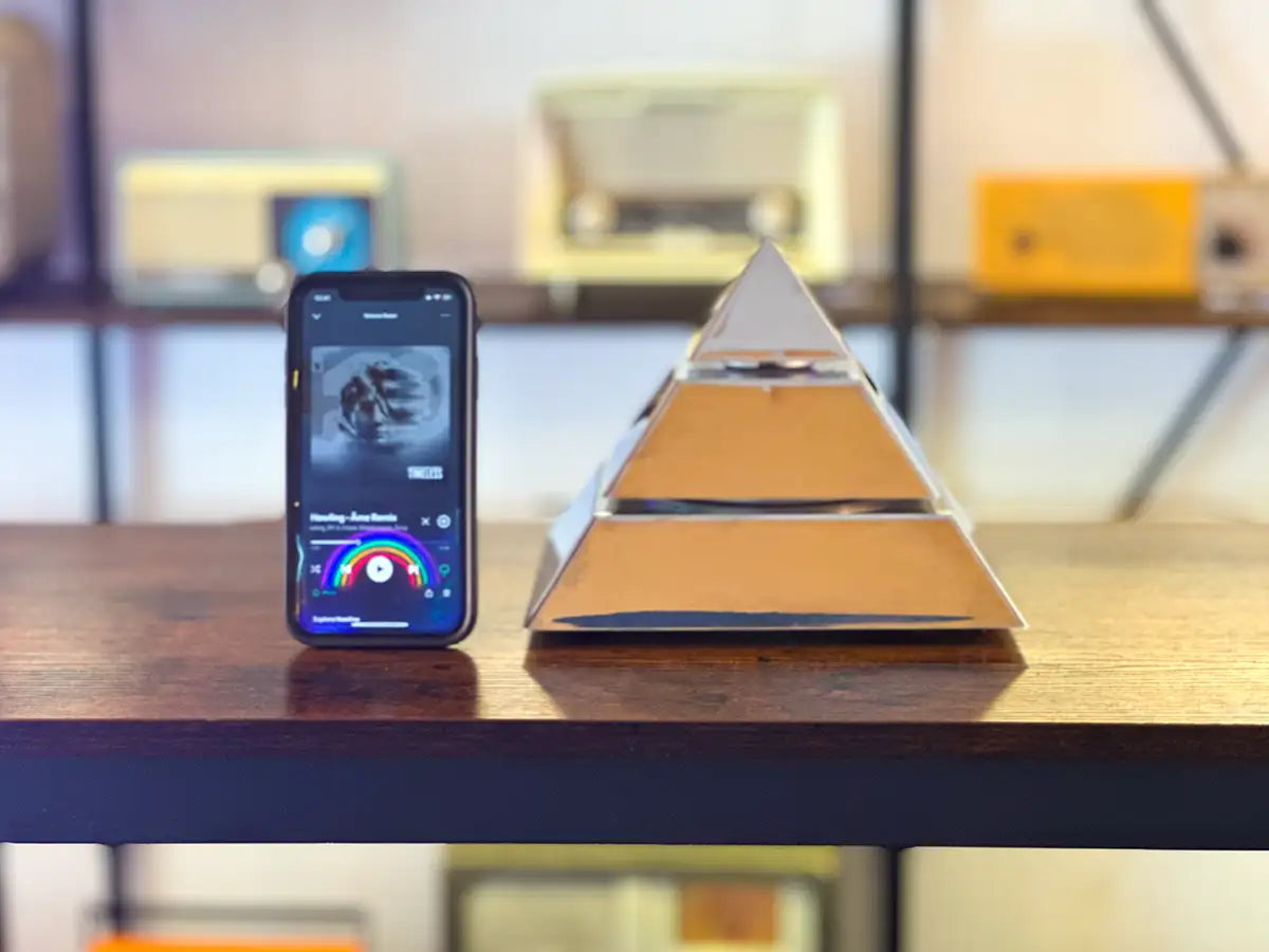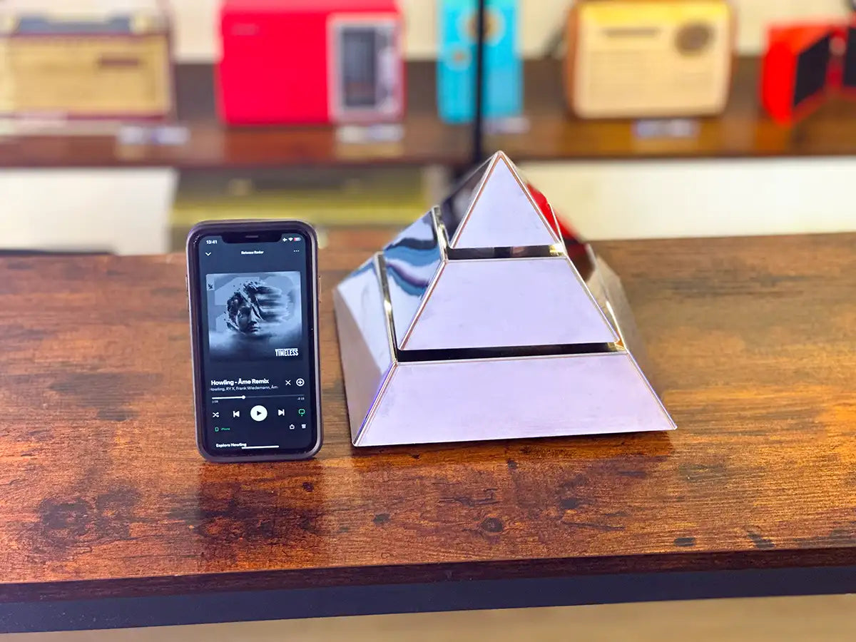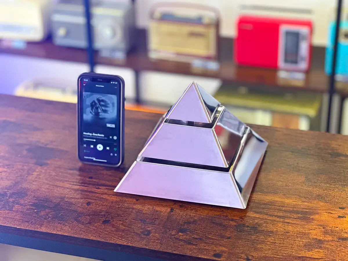 VINTAGE RADIO CONVERTED INTO BLUETOOTH SPEAKER. Model Pyradio made in Hong Kong in 1985. Chrome-plated plastic outer casing. Extremely rare piece. The sound comes from a small speaker hidden in the bottom. The top and middle of the pyramid can rotate when pushed. Dimensions: 20 cm x 20 cm, depth 15 cm .
