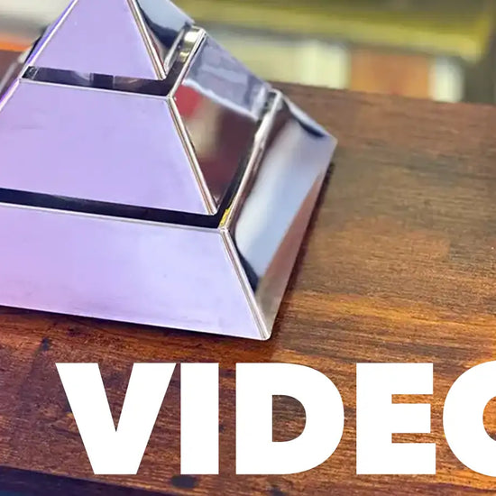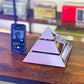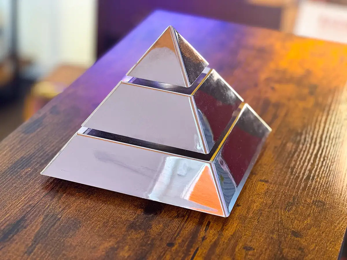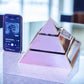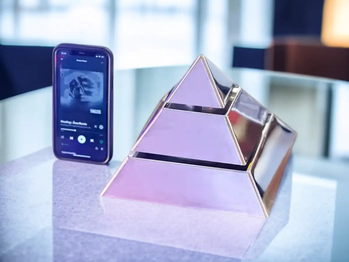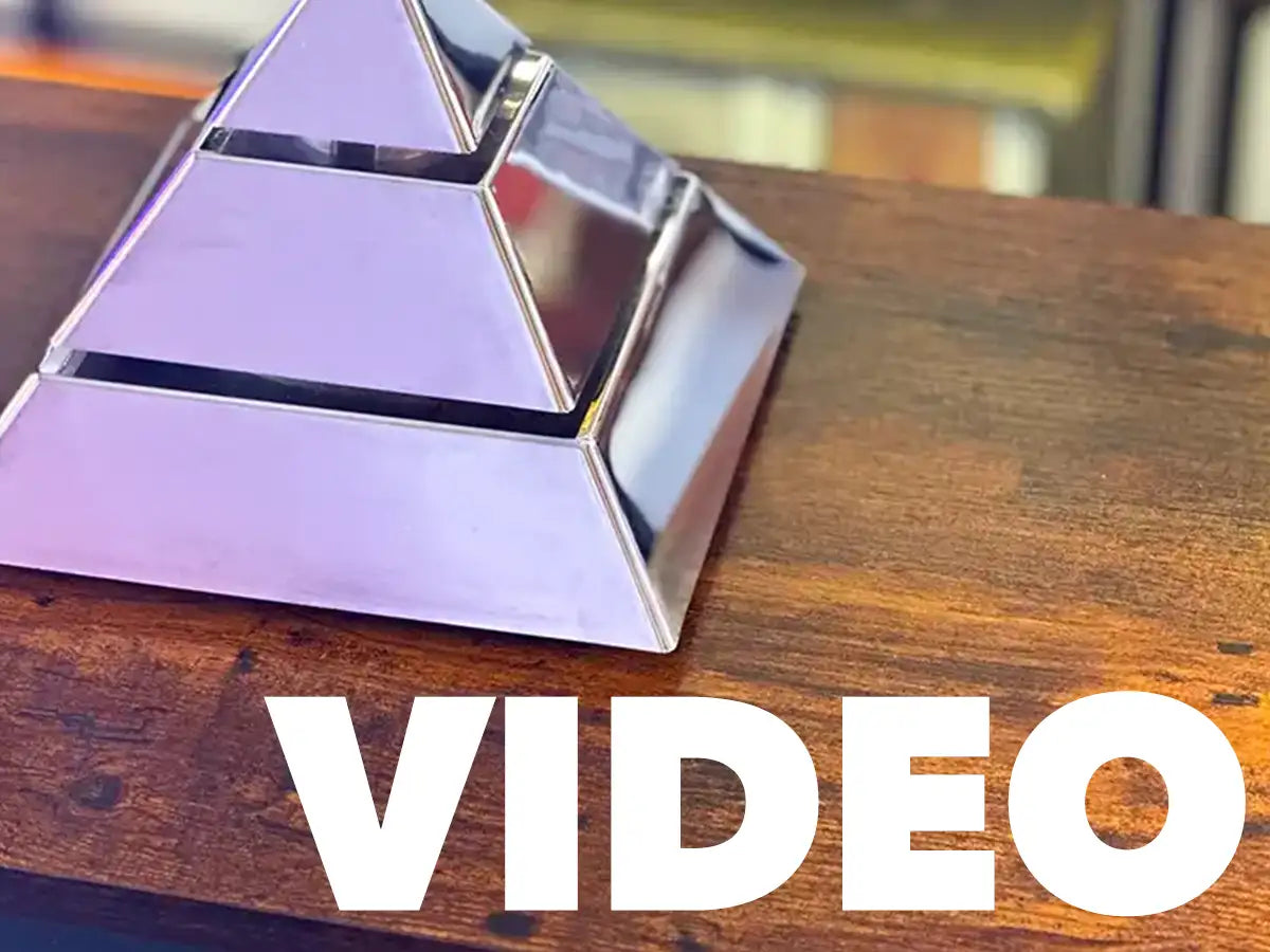 VINTAGE RADIO CONVERTED INTO BLUETOOTH SPEAKER. Model Pyradio made in Hong Kong in 1985. Chrome-plated plastic outer casing. Extremely rare piece. The sound comes from a small speaker hidden in the bottom. The top and middle of the pyramid can rotate when pushed. Dimensions: 20 cm x 20 cm, depth 15 cm .
