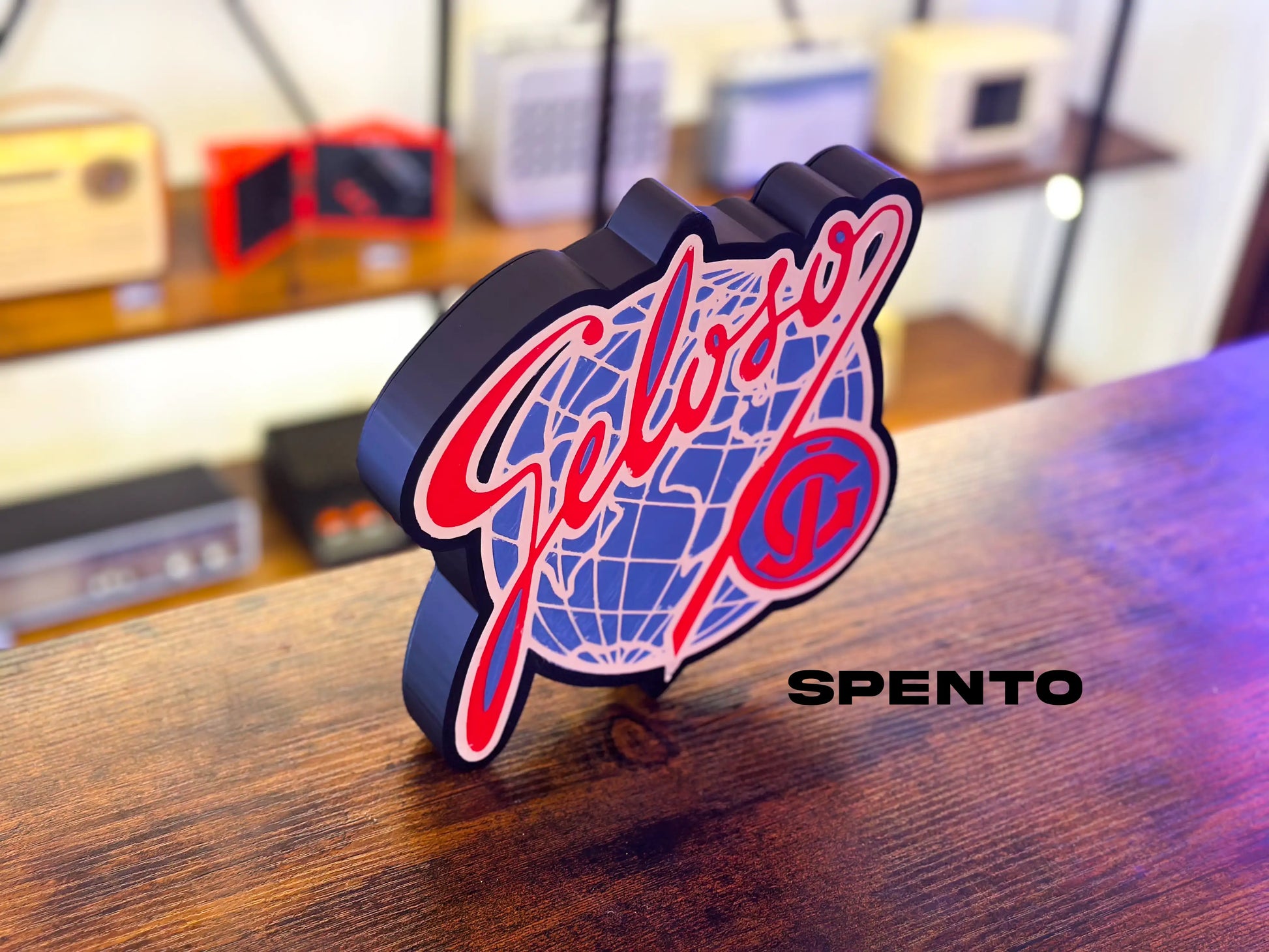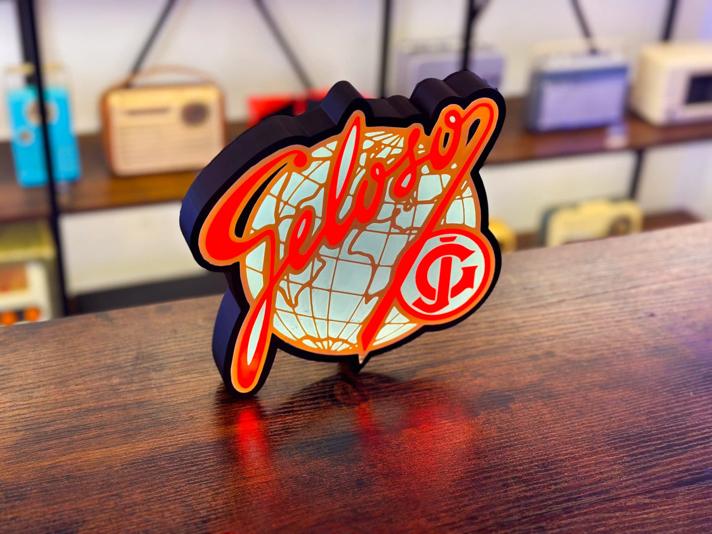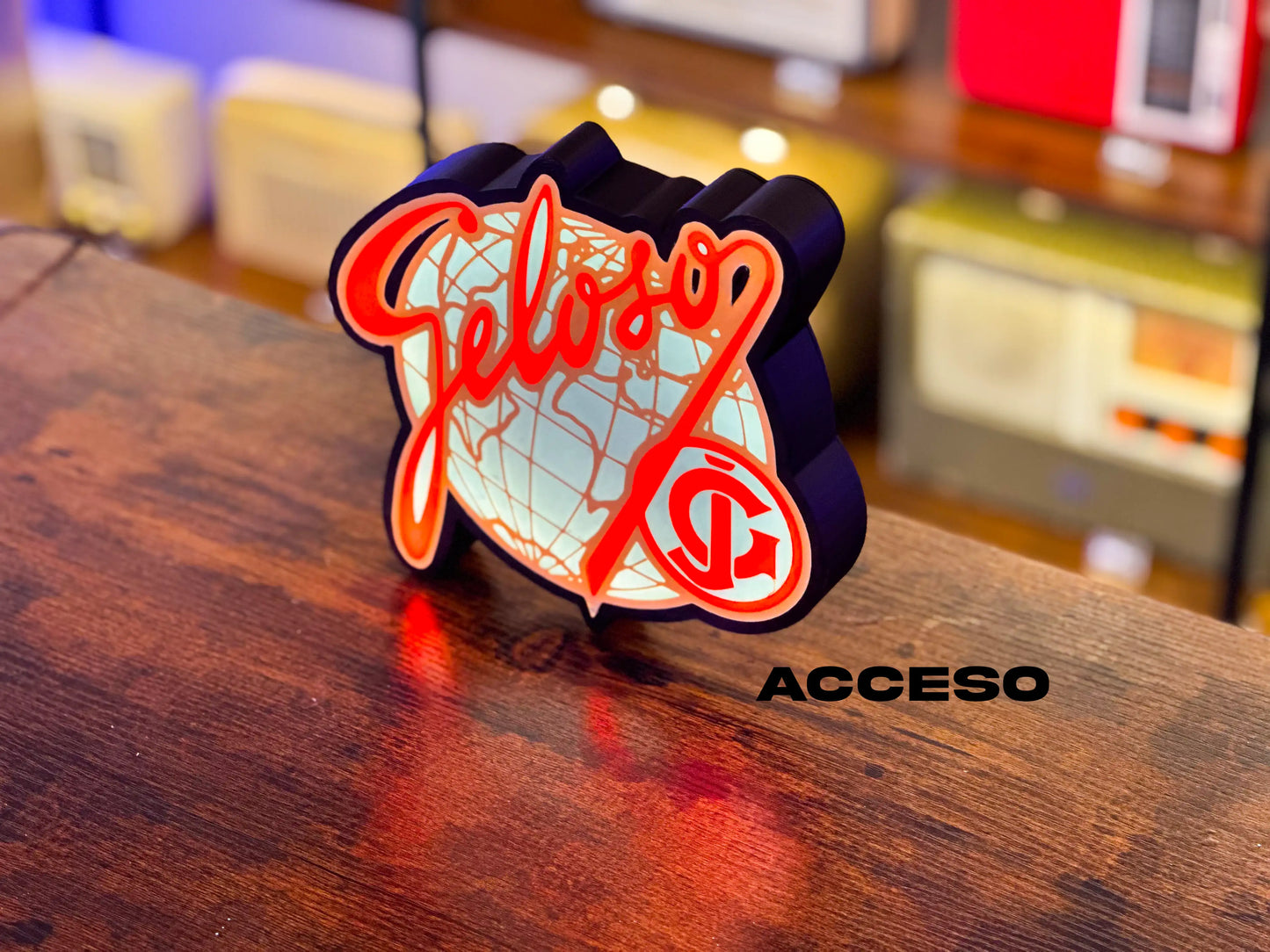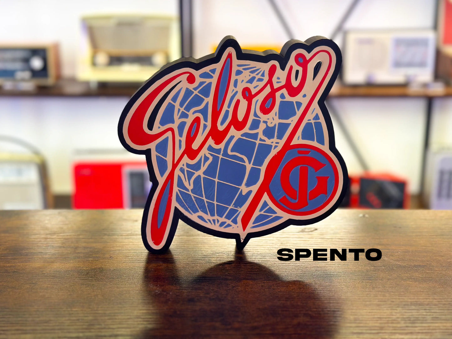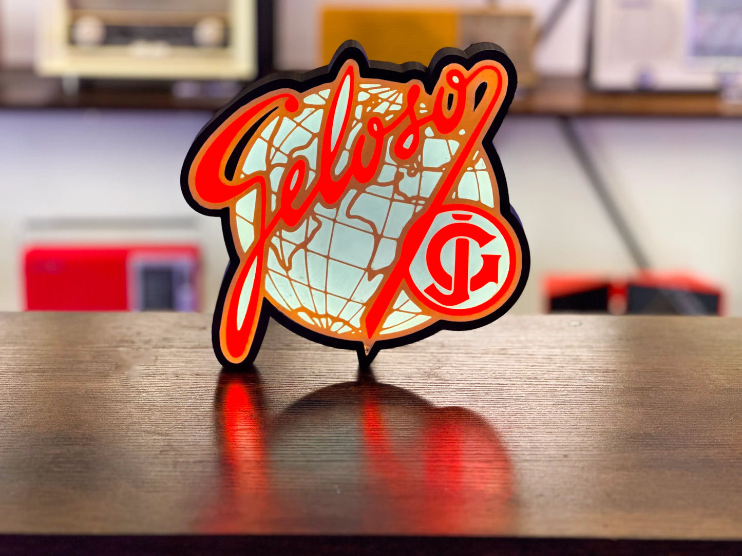 Il logo Geloso, riprodotto fedelmente nel nostro laboratorio, prende vita grazie a una retroilluminazione LED a basso consumo, ma dal grande impatto visivo. La luce diffusa valorizza ogni dettaglio, rendendolo perfetto da esporre accanto a una radio d’epoca o su qualsiasi piano d’appoggio.