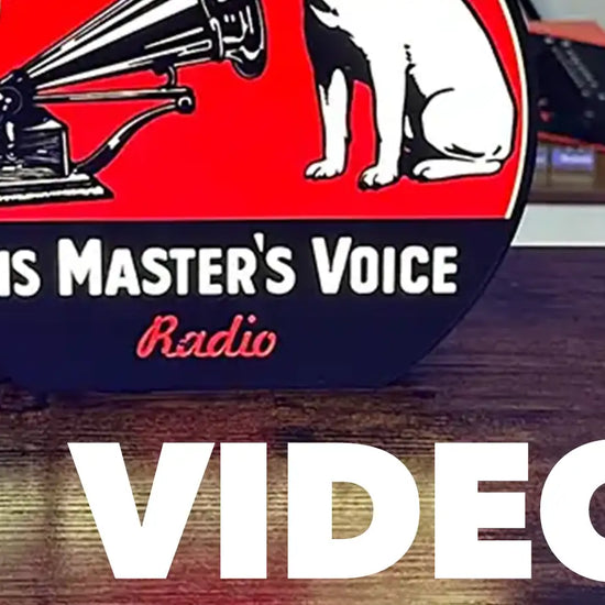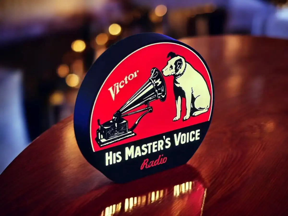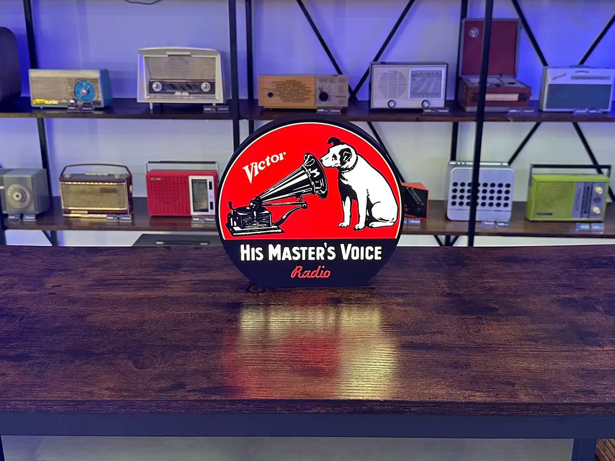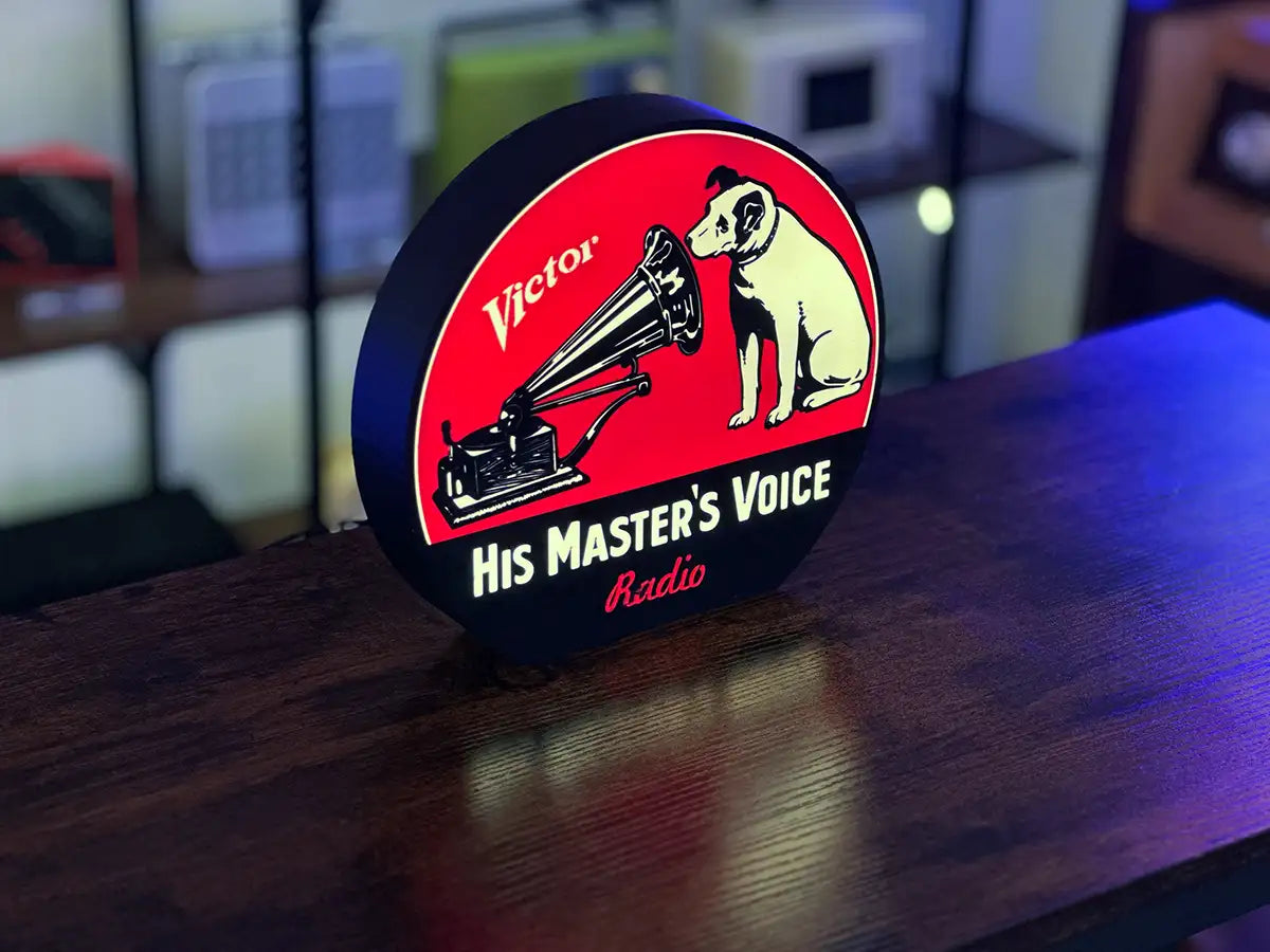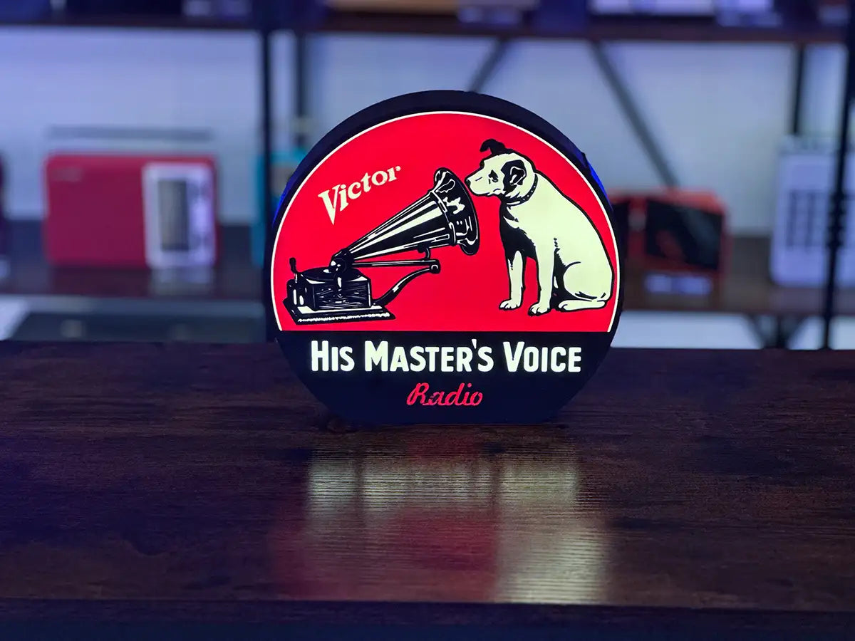 Questo lightbox con il celebre logo His Master’s Voice rende omaggio a un’immagine entrata nell’immaginario collettivo di generazioni di appassionati di audio e vinile.