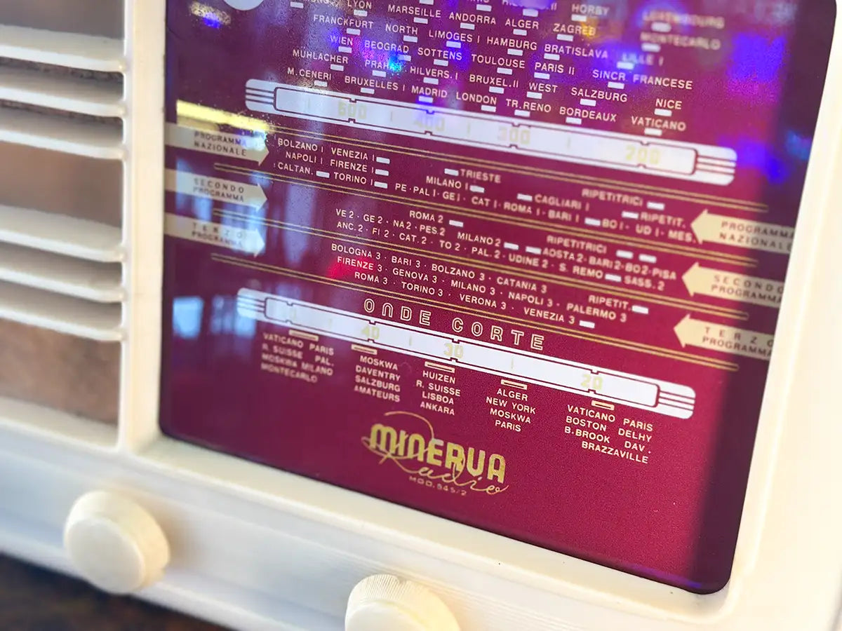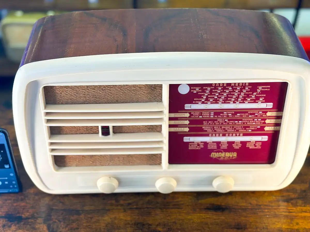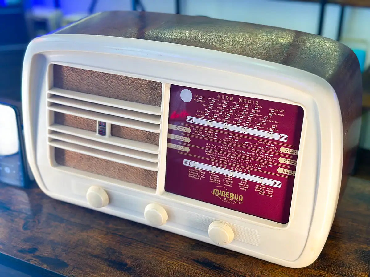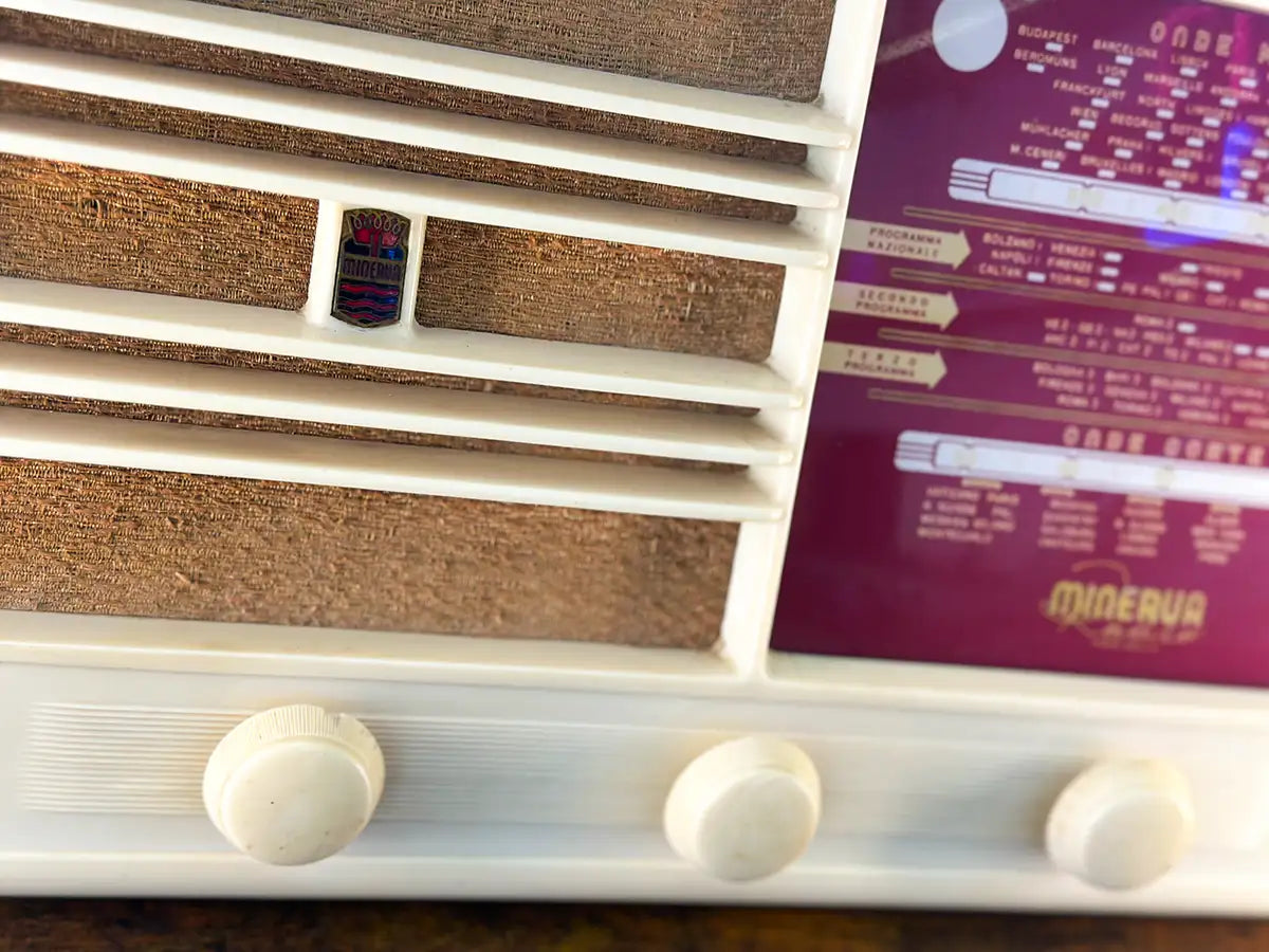 RADIO D'EPOCA CONVERTITA IN SPEAKER BLUETOOTH. Modello Minerva Amalfi 545/2 del 1940. Prodotta in Italia, Milano. Presenta minimi segni del tempo, raccontano e testimoniano l'autenticità del pezzo. Frontale in bachelite bianca e struttura in legno. Dimensioni: 48 cm x 28 cm, profondità 19 cm.
