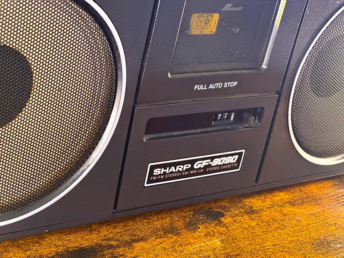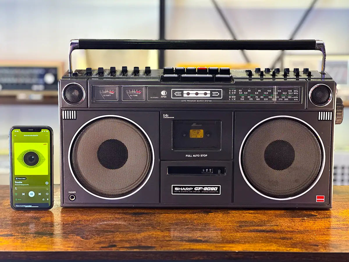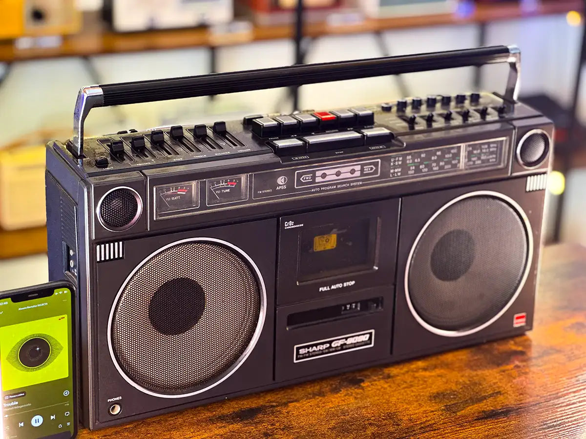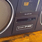 BOOMBOX CONVERTITO IN SPEAKER BLUETOOTH. Modello SHARP GF-8686 del 1980. Aggressivo e potente. Questo Boombox non era riparabile nelle sue funzioni originali di radio e cassetta, perciò lo abbiamo rigenerato trasformandolo esclusivamente in un puro speaker Bluetooth. Presenta minimi segni del tempo. Dimensioni approssimative 48 cm x 24 cm, profondità 15 cm.