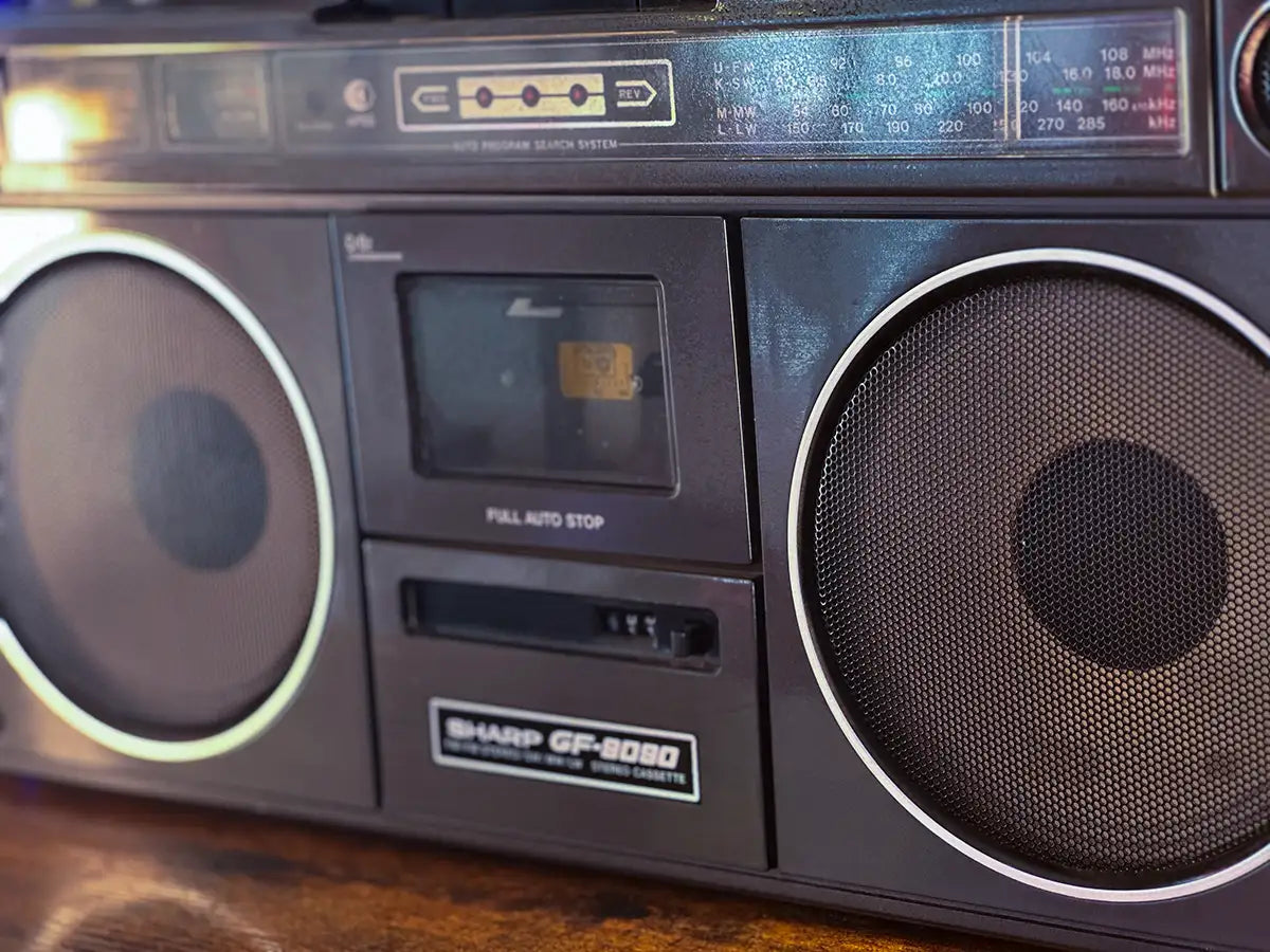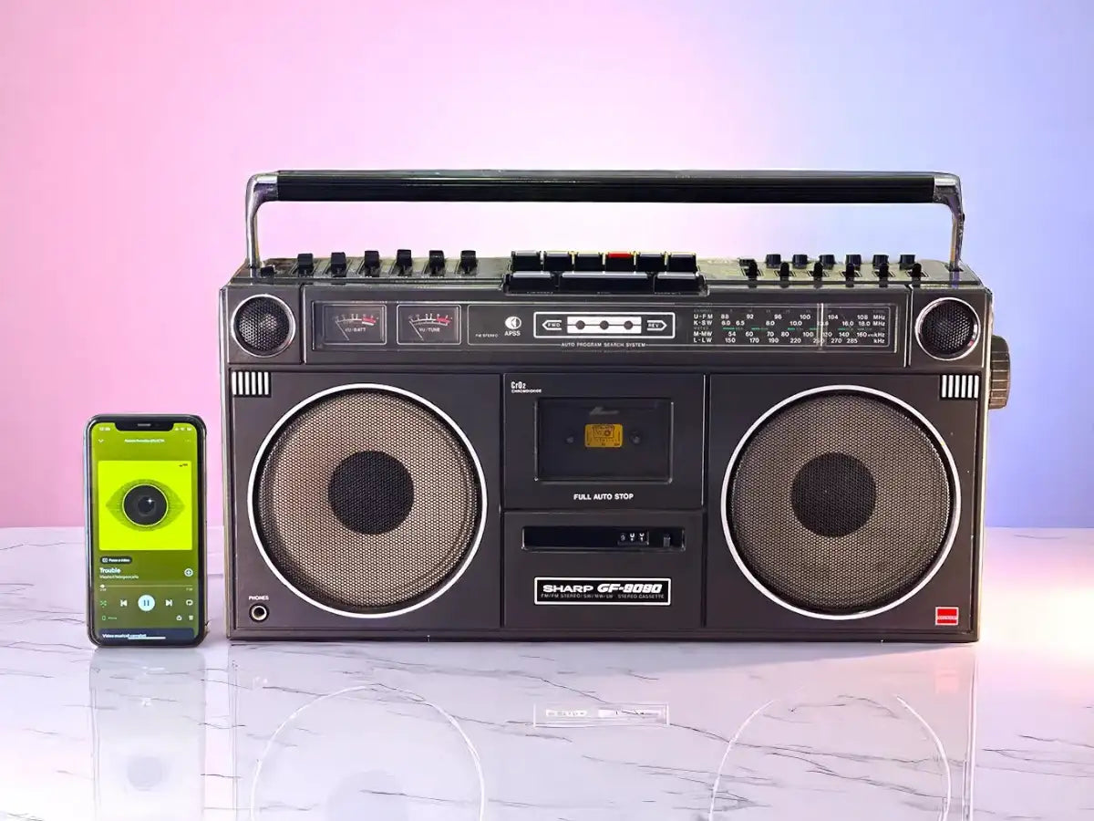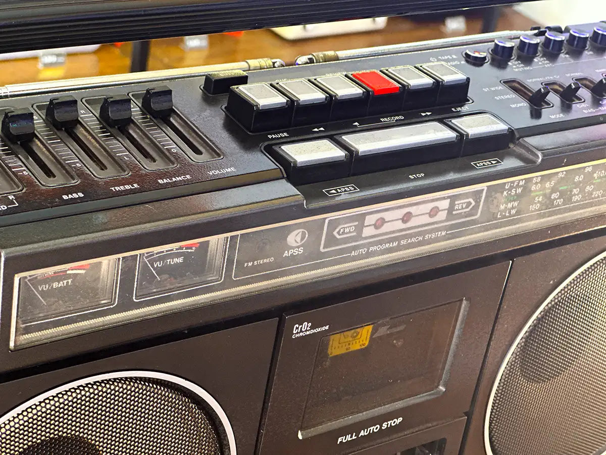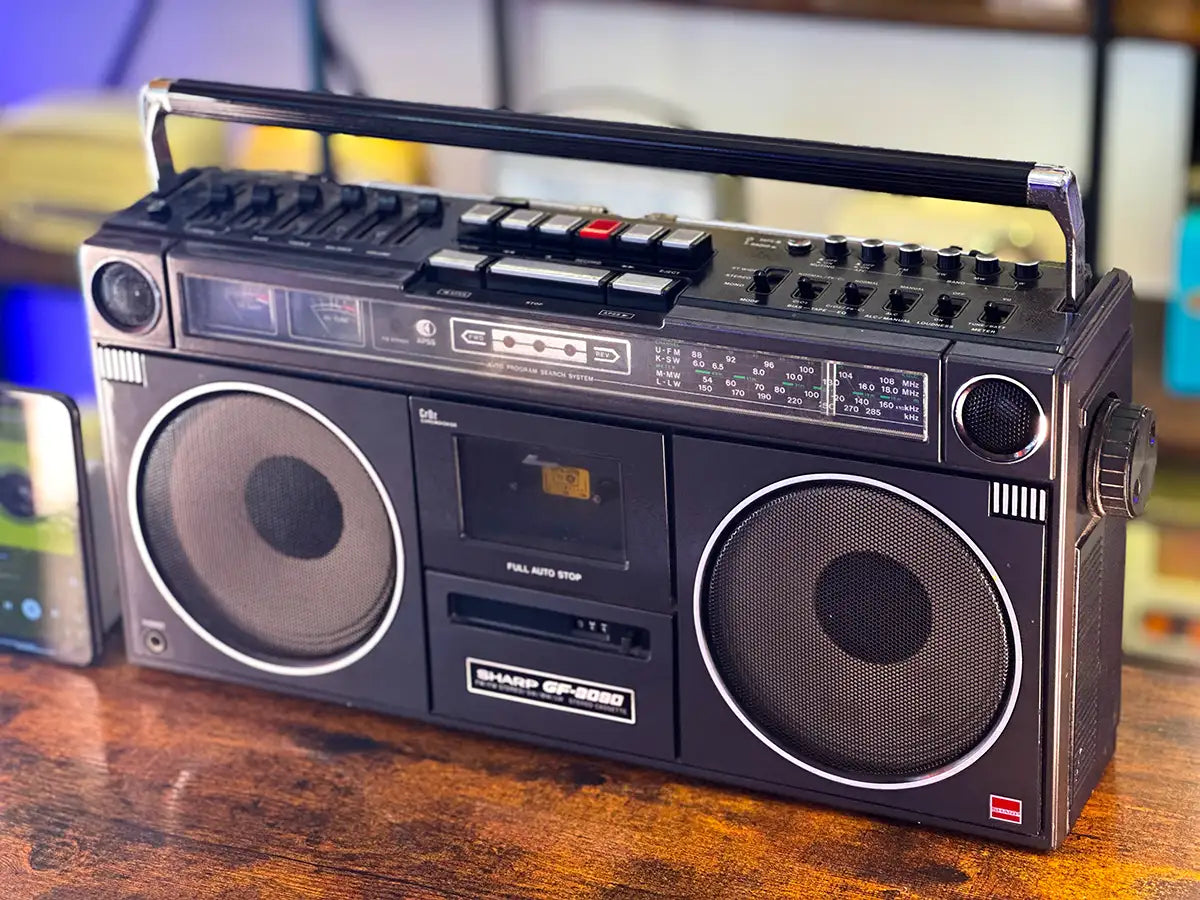 BOOMBOX CONVERTITO IN SPEAKER BLUETOOTH. Modello SHARP GF-8686 del 1980. Aggressivo e potente. Questo Boombox non era riparabile nelle sue funzioni originali di radio e cassetta, perciò lo abbiamo rigenerato trasformandolo esclusivamente in un puro speaker Bluetooth. Presenta minimi segni del tempo. Dimensioni approssimative 48 cm x 24 cm, profondità 15 cm.